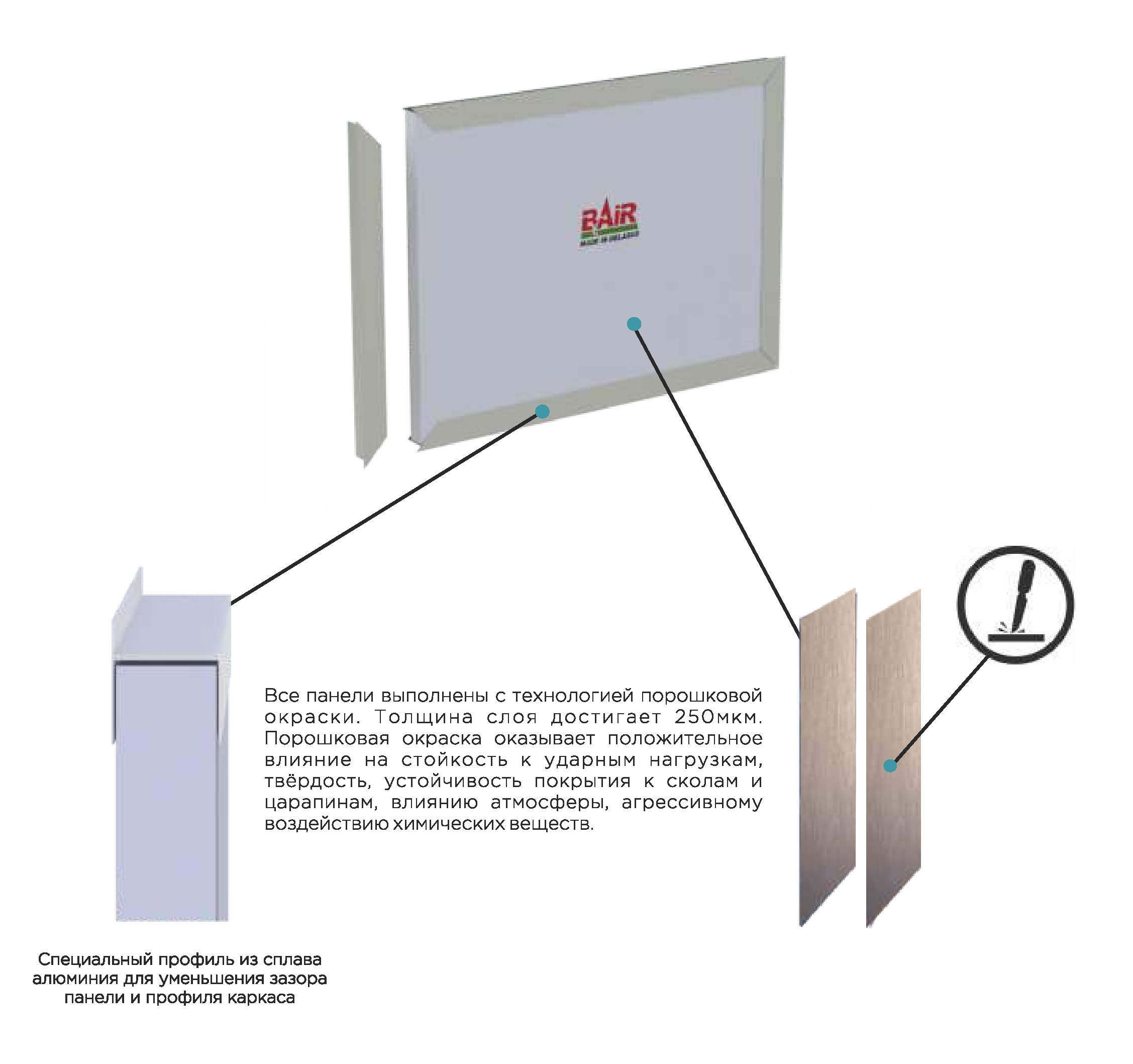 Уникальная конструкция панелей обеспечивает минимальный зазор между панелью и каркасом, исключая проникновение влаги и подсос воздуха. Это также продлевает срок службы корпуса.
