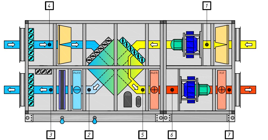 - Режим работы “ЛЕТО”. В теплый период года, когда на улице устанавливается теплая сухая погода, влажный воздух забирается из помещения и в полном объеме выбрасывается наружу, а в помещение подается свежий приточный воздух. При необходимости включается тепловой насос и подогревает приточный воздух за счет тепла, отведенного от вытяжного воздуха.