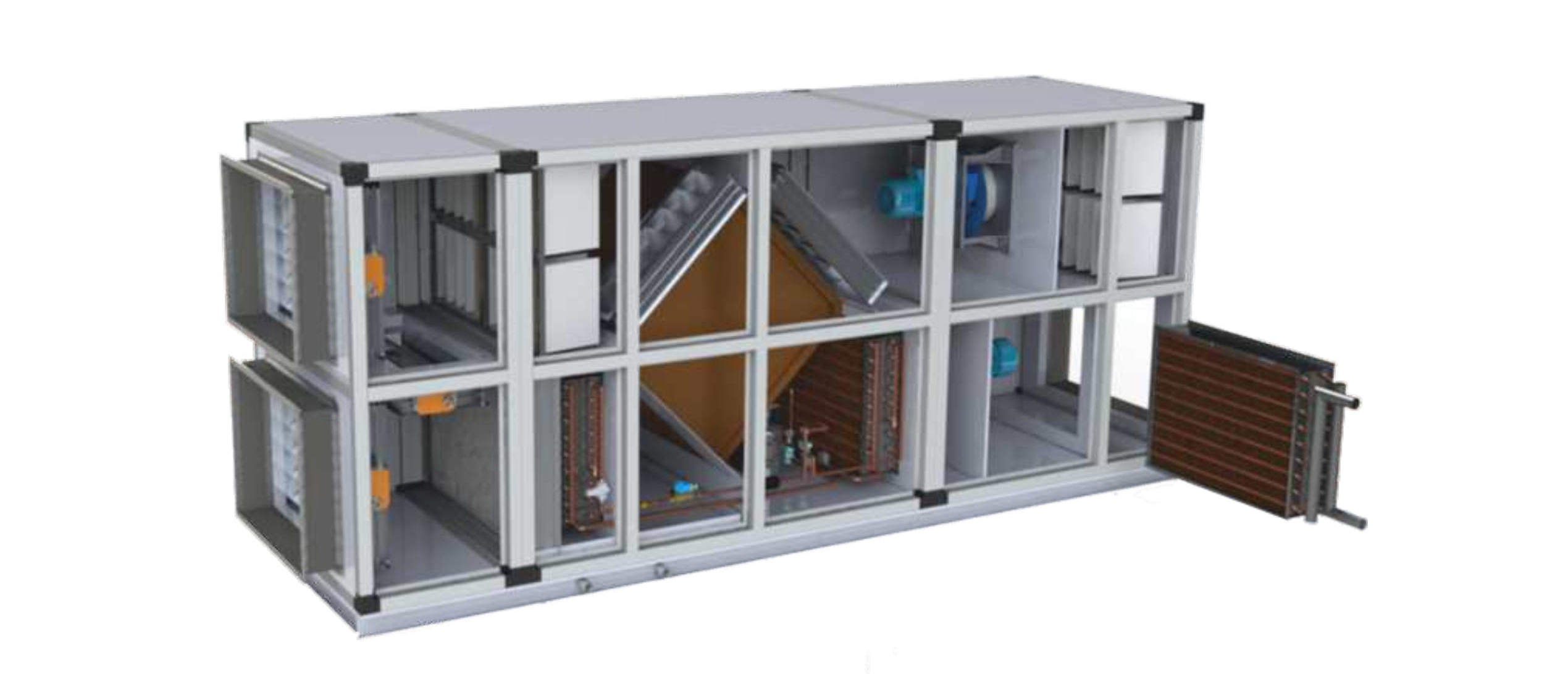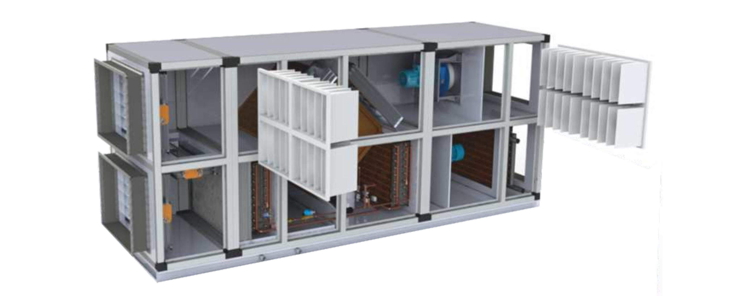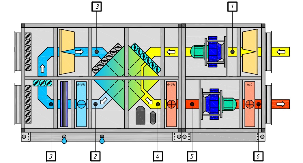 - Воздухораспределительная (воздухоприемная) секция в зависимости от режима работы установки и параметров воздуха в помещении бассейна либо разделяет потоки наружного и вытяжного воздуха, либо перепускает вытяжной воздух на рециркуляцию, отсекая при этом поток наружного воздуха. Камера смешения предназначена для приготовления оптимальной смеси свежего наружного и вытяжного воздуха. Контролировать количество свежего воздуха необходимо для обеспечения кислородом всех посетителей и обслуживающий персонал бассейна, а также для ассимиляции влажного воздуха более сухим приточным воздухом.