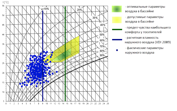 Согласно нормам VDI 2089 для расчета массового расхода воздуха влагосодержание (абсолютная влажность) наружного воздуха принимается равным 9 г/кг – синяя линия на диаграмме. Диапазон оптимальных параметров воздуха в зале бассейна соответствует влагосодержанию в пределах 11,5…16,0 г/кг . К слову, посетители бассейна наиболее комфортно чувствуют себя при содержании влаги в воздухе в количестве около 14,5 г/кг. Подача свежего воздуха с содержанием влаги не более 9 г/кг в зал бассейна гарантирует поддержание оптимальных параметров воздуха. Если после нанесения параметров наружного воздуха большая часть точек (70…100%) располагается слева от линии влагосодержания 9 г/кг, то в этом случае подходит метод осушения воздуха ассимиляцией (стандартный тип осушителя воздуха).