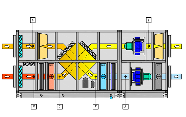 Вот как происходит процесс: вытяжной воздух [т.1] забирается из помещения бассейна, и получив тепло в рекуператоре [т.2] и конденсаторе теплового насоса [т.3], выбрасывается в окружающую среду. Свежий наружный воздух [т.4] в количестве 100% от производительности осушителя очищается в фильтре и предварительно охлаждается в рекуператоре [т.5]. Затем происходит конечное охлаждение воздуха до требуемой температуры в испарителе теплового насоса, работающего в реверсивном режиме [т.6].