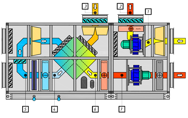 Рассмотрим процессы обработки воздуха для данного типа осушителя. Вытяжной воздух [т.1] забирается из помещения бассейна, и получив тепло в конденсаторе теплового насоса [т.2], выбрасывается в окружающую среду. Свежий наружный воздух [т.3] в количестве 100% от производительности осушителя очищается в допфильтре и предварительно охлаждается в рекуператоре [т.4]. Далее воздух охлаждается ниже точки росы в испарителе теплового насоса с выпадением конденсата на его теплообменной поверхности [т.5]. Конденсат стекает в поддон и удаляется через дренажную систему. Осушенный холодный воздух возвращается в рекуператор через приточный канал, где предварительно подогревается теплом следующей порции вытяжного воздуха [т.6]. Конечный нагрев происходит в конденсаторе теплового насоса [т.7]. Так как все система многоконтурная, можно распределять тепло между двумя конденсаторами, т.е. такой тип осушителя не только эффективно осушает воздух в помещении бассейна, но и позволяет более точно регулировать температуру подаваемого летом приточного воздуха.