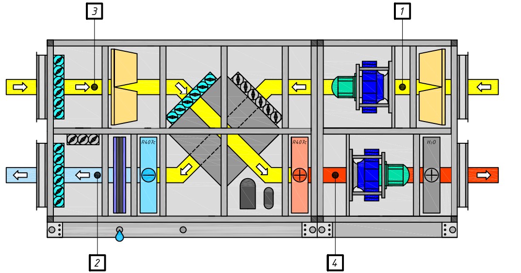 - Осушенный холодный воздух возвращается в рекуператор через приточный канал, предварительно подогреваясь теплом следующей порции вытяжного воздуха.