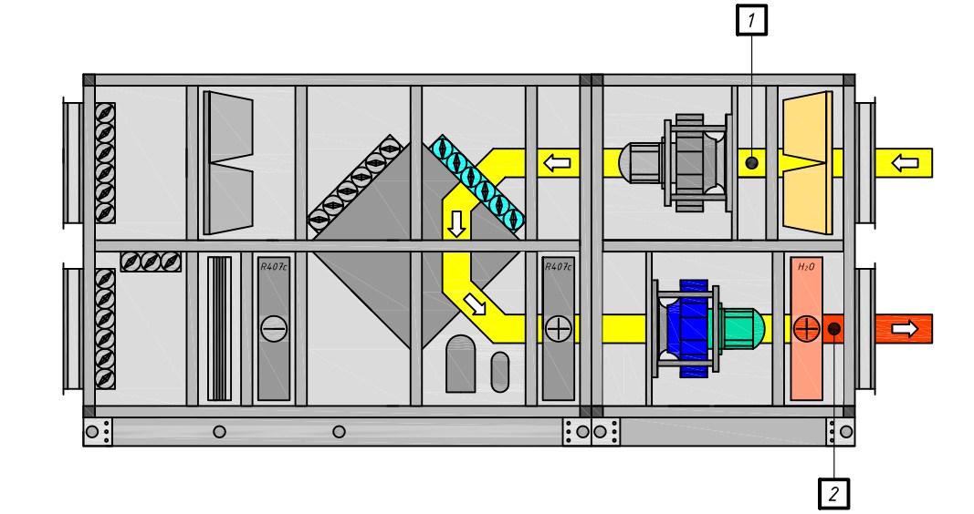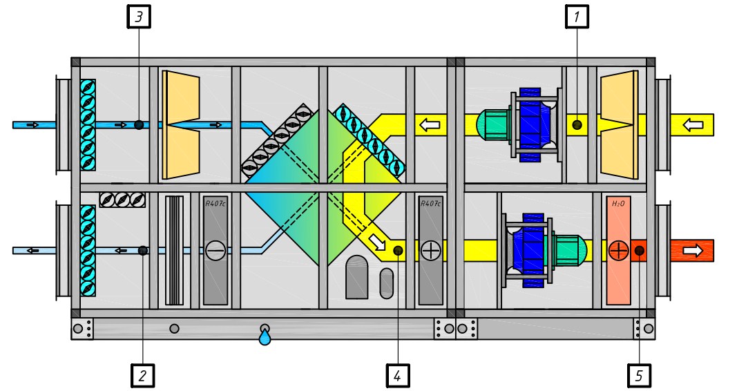 - Часть вытяжного воздуха смешивается с свежим воздухом (4) и проходит дополнительный нагрев в водяном воздухонагревателе (5) до необходимой температуры приточного воздуха.